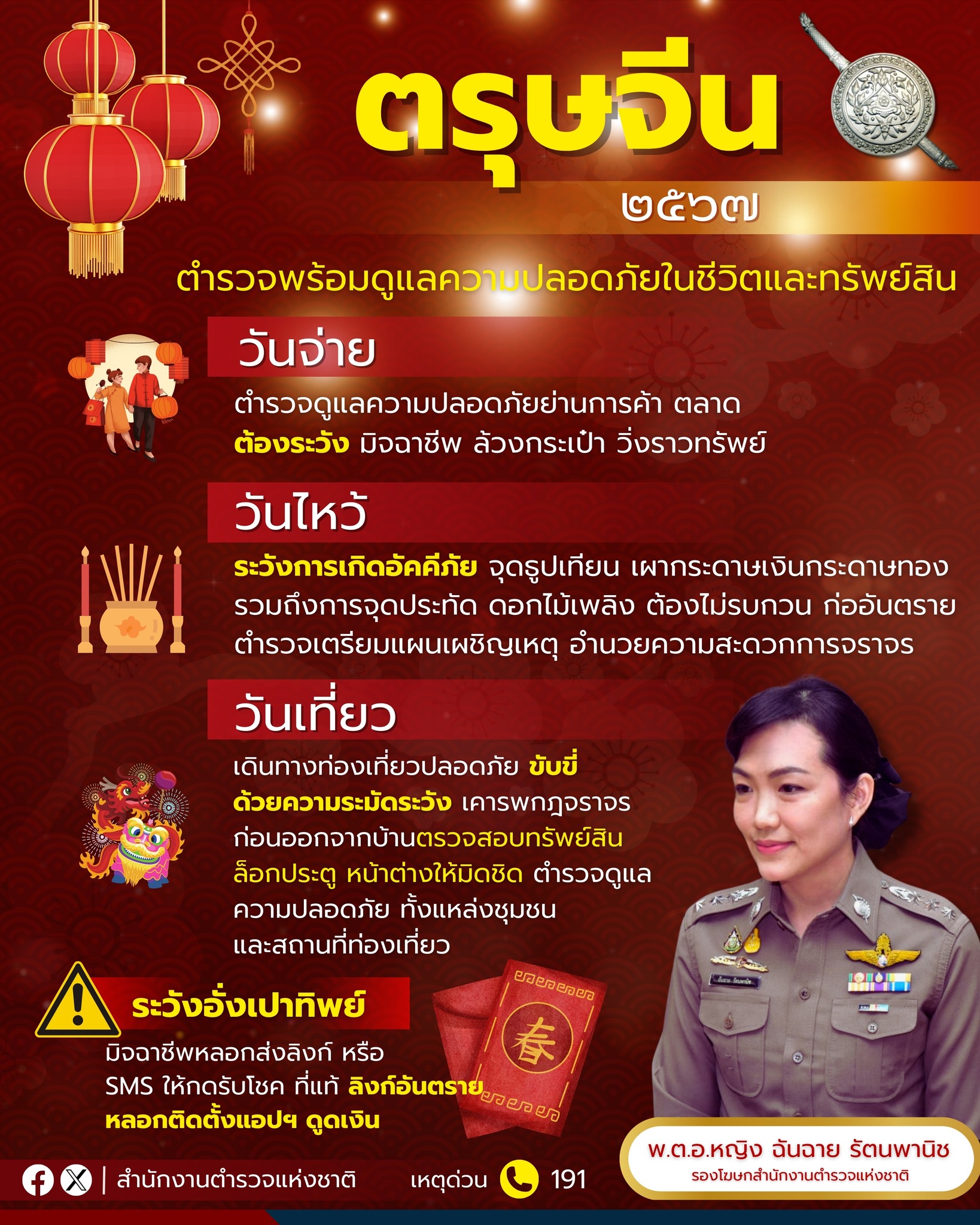 ผบ.ตร. สั่งการ 4 มาตรการให้ตำรวจดูแลประชาชน เพิ่มความเข้มงวด ด้านความปลอดภัยในชีวิตและทรัพย์สิน อำนวยความสะดวกด้านการจราจร ป้องกันมิจฉาชีพฉวยโอกาสในเทศกาล “ตรุษจีน 2567”