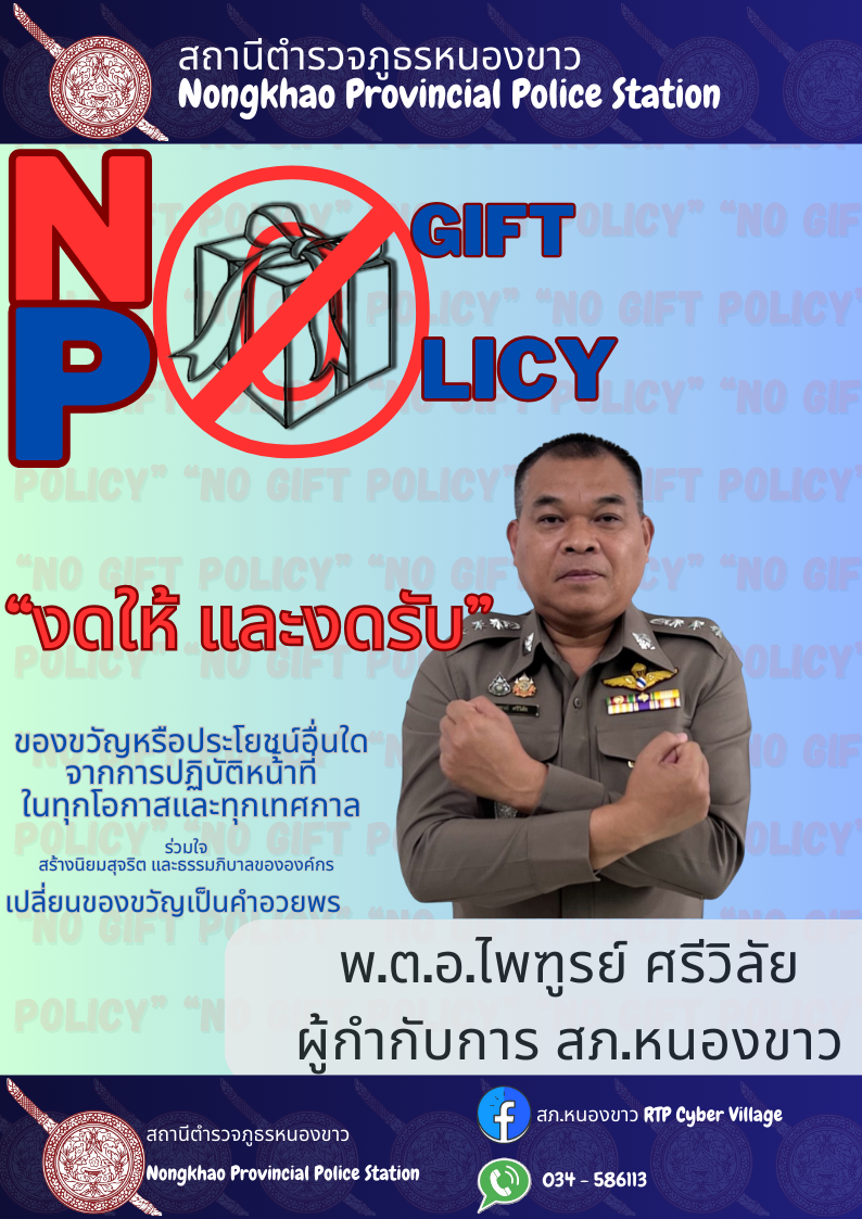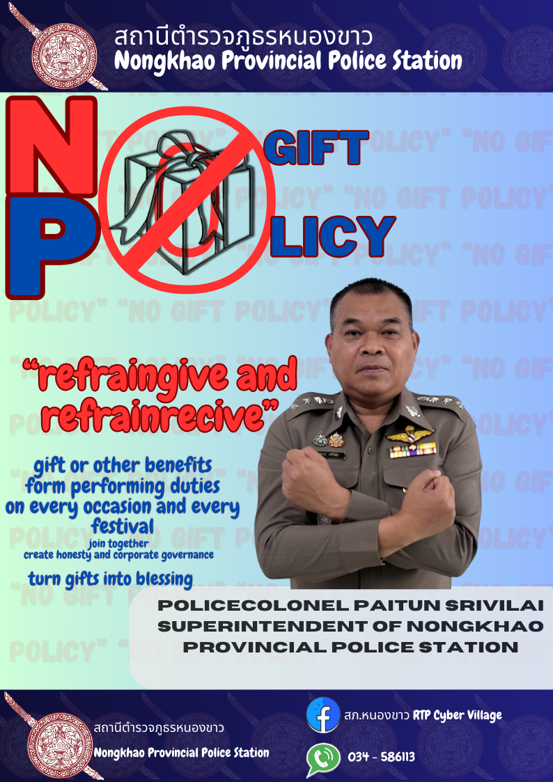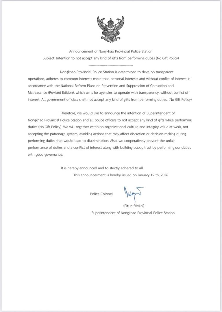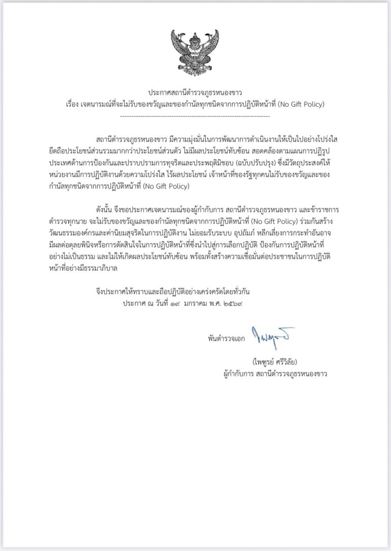 - ประกาศสำนักงานยุทธศาสตร์ตำรวจเรื่องเจตนารมณ์ที่จะไม่รับของขวัญหรือของกำนัลทุกชนิดจากการปฏิบัติหน้าที่
